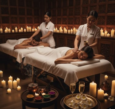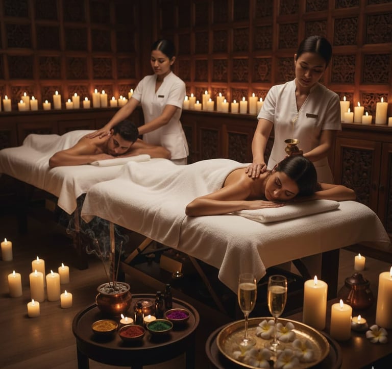 Masaje Abhyanga Sincronizado: Dos terapeutas trabajan en perfecta sincronía para aplicar el masaje Abhyanga con aceites calientes. Este masaje rítmico, profundo y envolvente, estimula los puntos marma (puntos energéticos vitales) liberando bloqueos y promoviendo el flujo de energía.