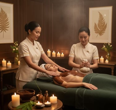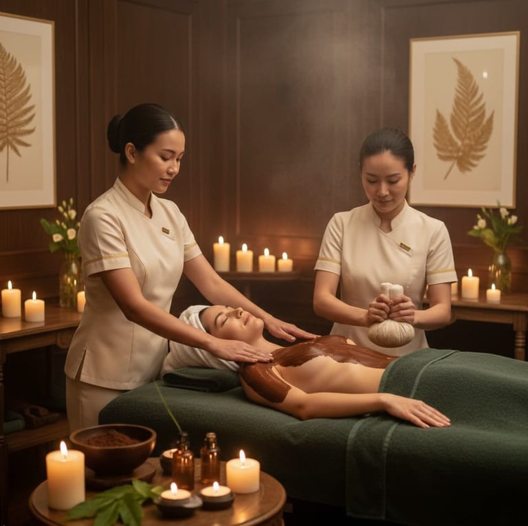 Comenzamos con un scrub de cacao puro que pule tu piel, seguido de una envoltura fundente que aprovecha las propiedades antioxidantes del chocolate para nutrirte desde el exterior. El clímax llega con el masaje a cuatro manos: una danza rítmica con aceites ayurvédicos calientes y el uso de pindas herbales, cuyos vapores y calor medicinal penetran en tus músculos para disolver cualquier rastro de estrés.